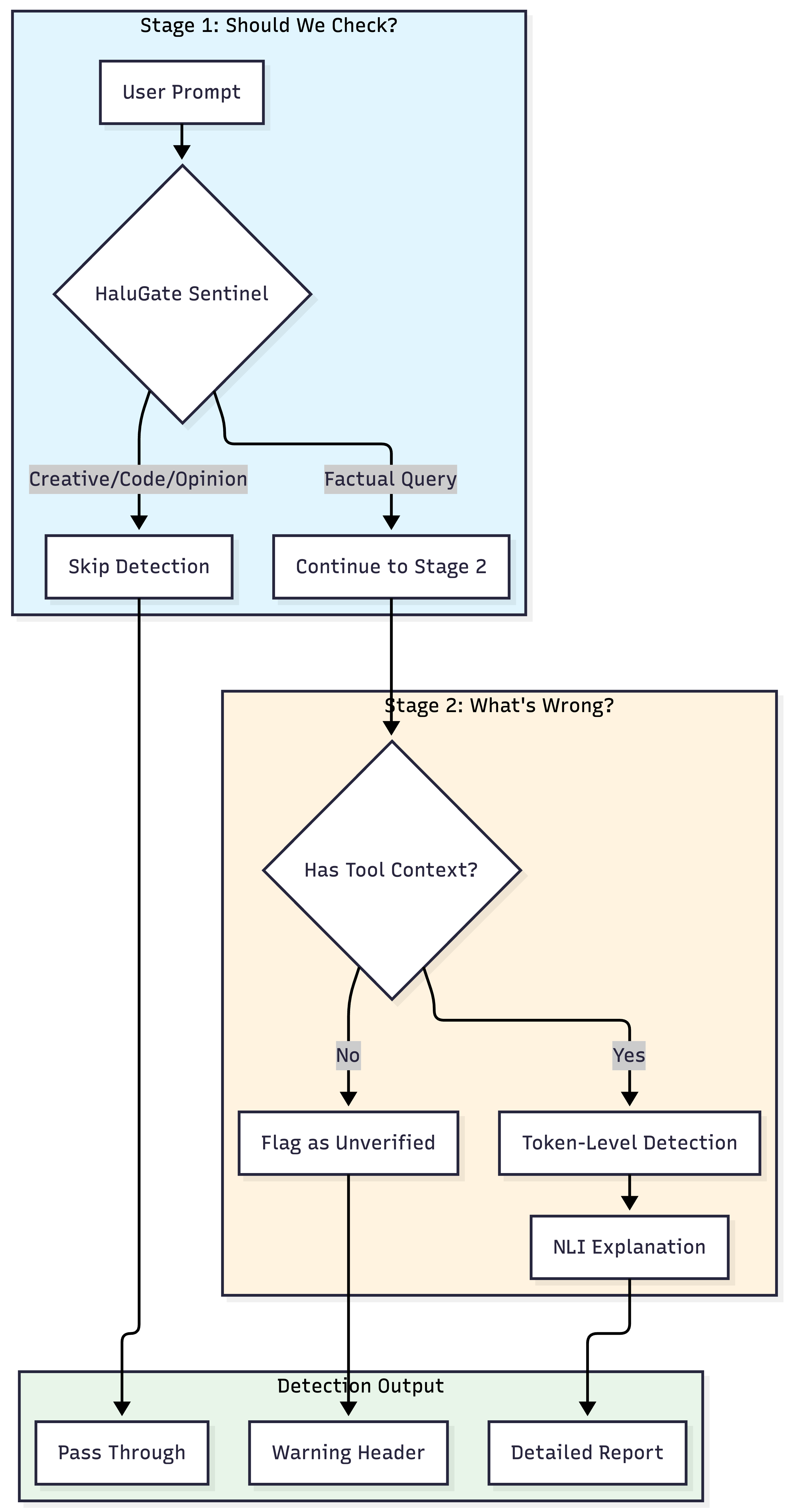 HaluGate implements a conditional two-stage pipeline that balances efficiency with precision: