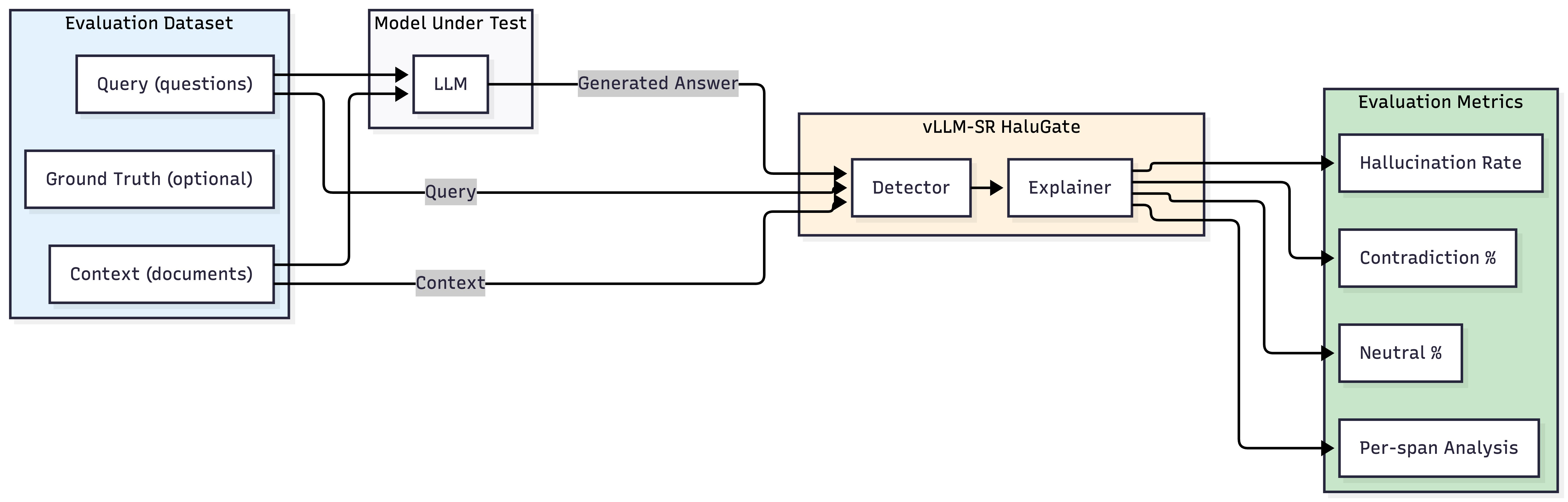 While HaluGate is designed for real-time production use, the same pipeline can power offline model evaluation. Instead of intercepting live requests, we feed benchmark datasets through the detection pipeline to systematically measure hallucination rates across models.
